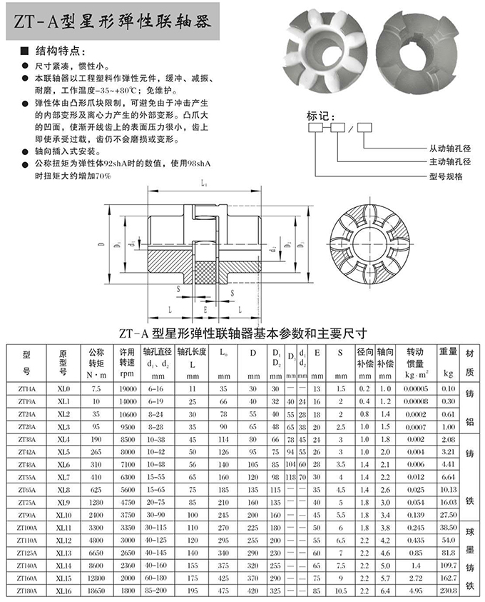 瑞安市寶德隆機械配件有限公司提供ZT-A型星形彈性聯(lián)軸器具有拆裝方便,快速安裝等特點,廣泛用于連接/固定輪轂孔和零件的軸,例如齒輪,錐齒輪,鏈輪,葉輪,凸輪,皮帶輪和飛輪等軸的聯(lián)結固定,咨詢電話:18906872378
